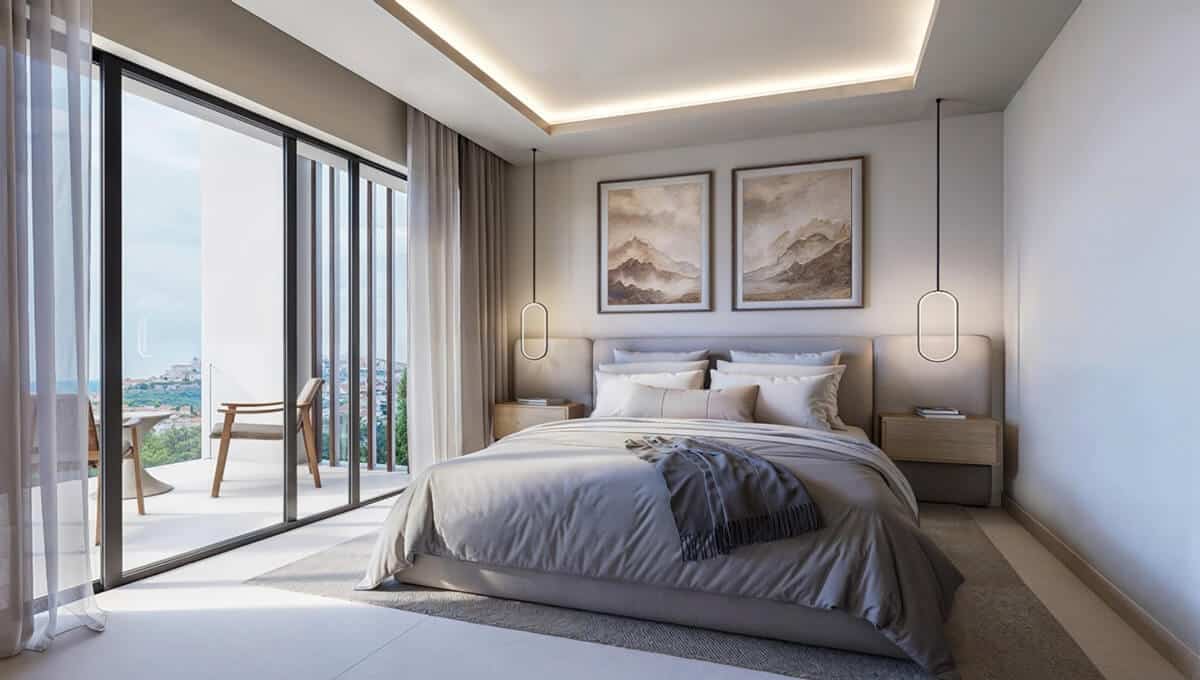 Large living rooms open directly onto terraces, creating a seamless indoor-outdoor lifestyle with panoramic views of the surrounding landscape and the Mediterranean. The open-plan kitchen with a central island forms the heart of the home, combining functionality with elegant, modern design. Bedrooms are calm and generous, designed for rest and privacy, while bathrooms feature a clean, contemporary, minimalist aesthetic.