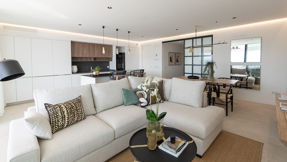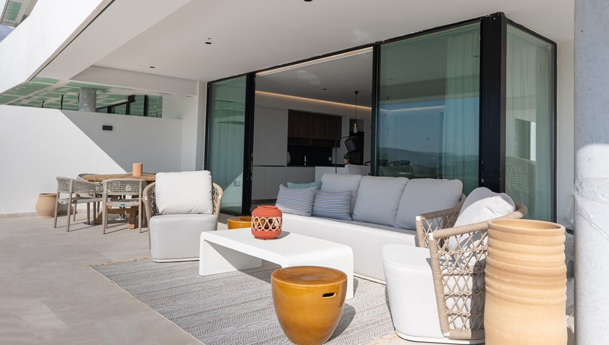 Contemporary 2-bedroom duplex penthouse for sale in El Mirador de Estepona Hills. All the properties in this modern development have large floor-to-ceiling windows that provide natural light while at the same time framing the panoramic views of the city and the Mediterranean Sea. The interiors are open and bright, with a beautifully fitted kitchen opening into the living area and an ample terrace. The ground-floor apartments have a private garden, and all the penthouses are duplexes with a large solarium. There is underground parking and storerooms included.