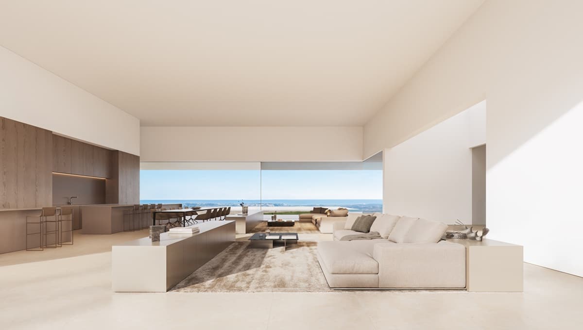 The villa sits on a 4502m2 plot, with 2041 square metres of living space that seamlessly integrates indoor and outdoor areas. Its high ceilings, large windows, and modern design fill it with natural light. The open-plan kitchen, dining, and living area connect to a courtyard and terraces with stunning Mediterranean views. It features six suites with en-suite bathrooms and an optional guest area.